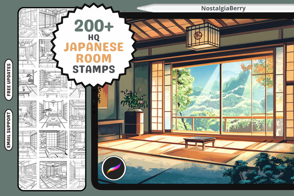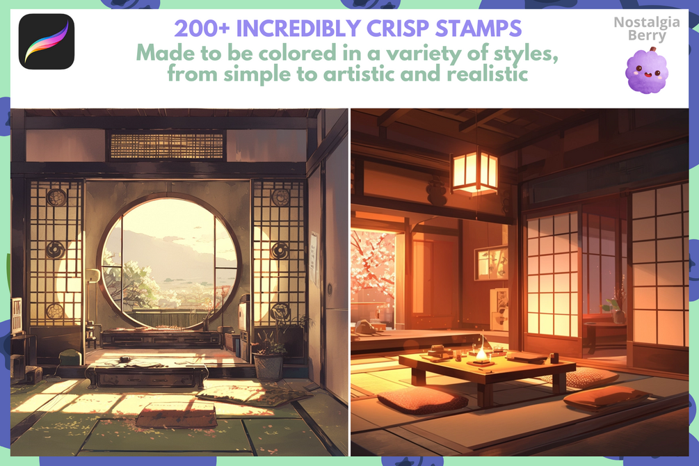 Bring traditional Japanese interiors to your art with this set of full room stamps for Procreate! 🏯 Whether you’re illustrating serene tatami rooms, cozy manga settings, or intricate anime backgrounds, this set is here to save you tons of time without sacrificing detail.