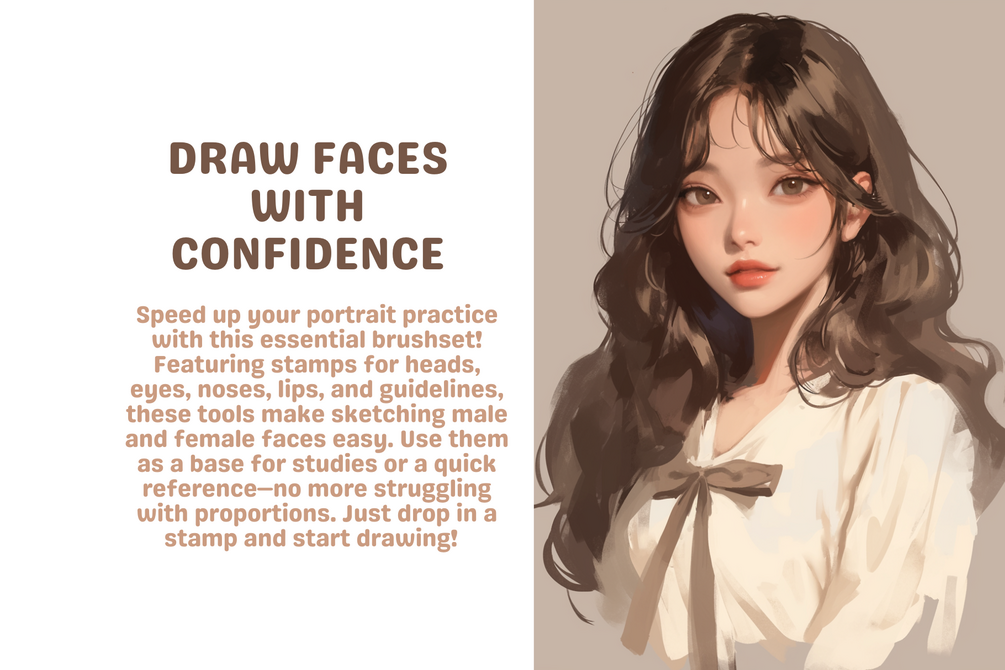 Perfect for illustrators, character designers, and art students, this set saves time and helps you practice efficiently. Use the stamps as a starting point, build upon them, and develop your unique style with ease. Whether you're sketching studies or creating finished portrait pieces, this toolkit will become an essential part of your workflow. ✨